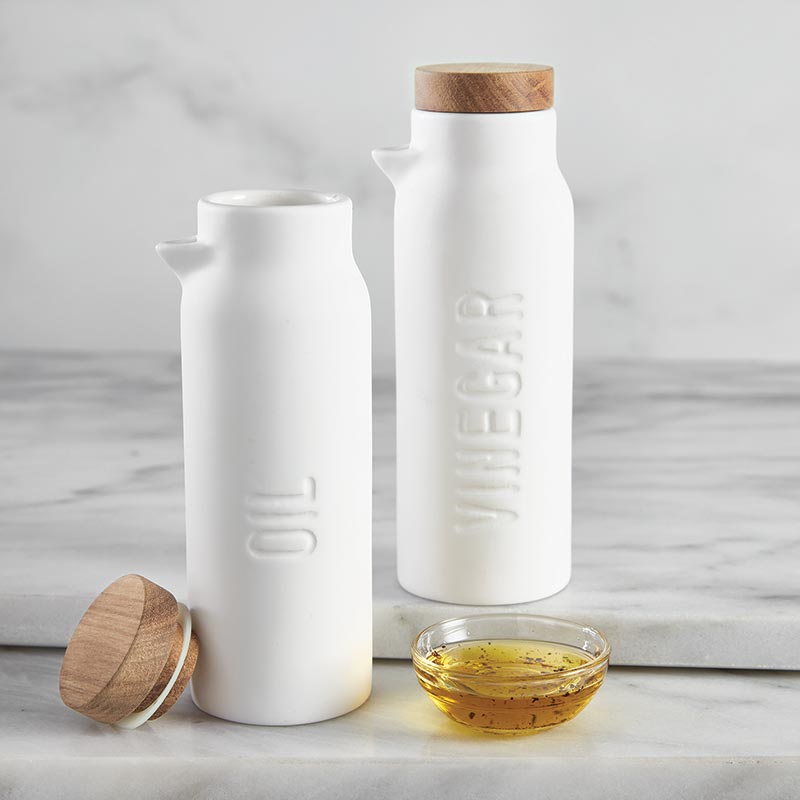 These handcrafted, matte white ceramic bottles protect olive oil and vinegar from sunlight, keeping each fresh while providing a casual kitchen-to-table presentation. Perfect hostess or housewarming gift!