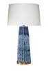 The simple lines of this cornflower blue ceramic lamp are elevated with a unique pleated effect inspired by Japanese streetwear. We keep the fashion-forward look sleek with the addition of a tapered, rolled-edge linen shade. A metal base and trapezoidal finial, both with a gleaming antique brass finish, add just a touch of shine. At once modern and timeless, this is a look that will always be in style.